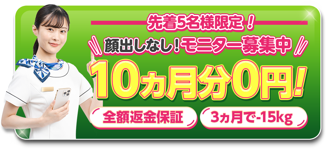 ※他キャンペーンとの併用不可 ※コース提供前より3%体重減少が見られなかった方は全額返金 ※結果には個人差があります